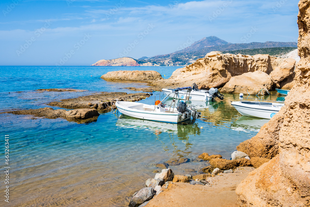 Boats in small bay near beautiful sandy Fyriplaka beach with azure sea water, Milos island, Cyclades, Greece