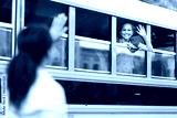 Young mom waving goodbye to happy daughter sitting in yellow school bus