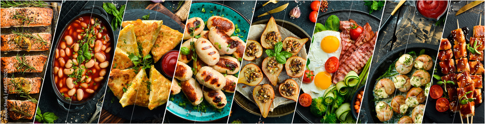 Photo with a set of various dishes, snacks and food. Collage of different assortment of food.