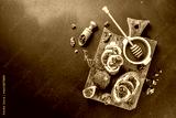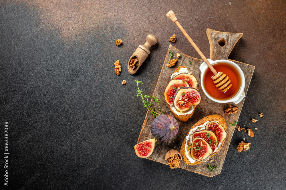 Sandwich with ricotta, fresh figs and honey on a wooden board on a dark background. top view. place for text