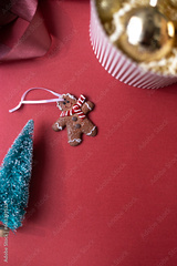Christmas decoration gingerbread man cookie with fir tree on the red background. Close up winter holidays greeting card. Copy space