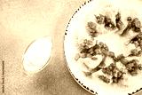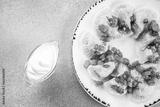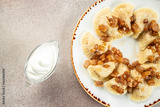 vareniki dumplings with potato, fried onion and sour cream on a light background top view. place for text