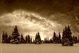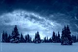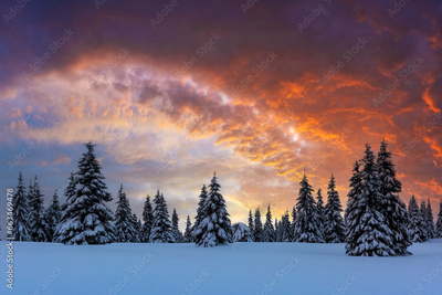 Incredible landscape with snow-covered conifers in a wintery mountain glade with a glowing sunset sky and bright orange clouds. Winter mountains background
