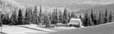 A mountain glade adorned with snow-draped fir trees and a charming wooden house in a winter setting. Winter mountains landscape panorama