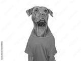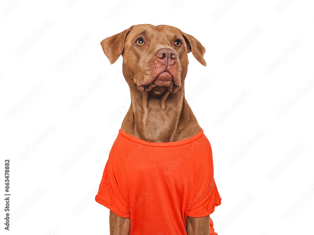 Cute brown dog and red T-shirt. Isolated background. Close-up, indoors. Studio shot. Day light. Beauty and fashion. Concept of care, education, training and raising pets