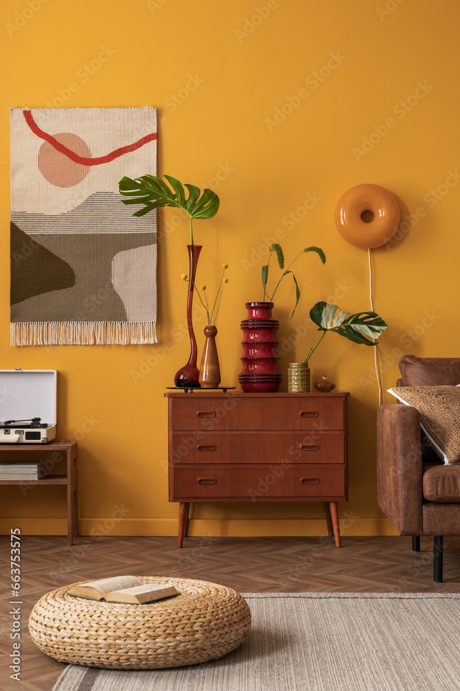Warm and cozy living room interior with wooden sideboard, brown sofa, vase with braided pillows, book, vase with leaves, killim rug, gramophone and personal accessories. Home decor. Template.