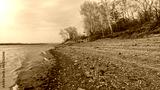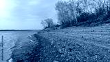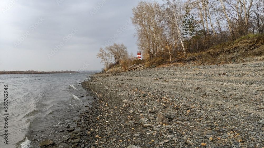 a stone seashore in autumn, a lighthouse is visible in the distance. landscape.