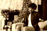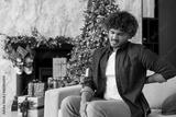 A sick man on Christmas has severe back pain, massages muscle his handб sitting on sofa in living room. Hispanic celebrating New Year and Christmas holidays on a winter day near tree with gifts.