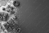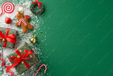 Christmas wonderland top view: Green presents, gleaming baubles, gingerbread man ornament, ringing bells, dainty wreath, candy cane, lollipop, snow against a green backdrop with text space