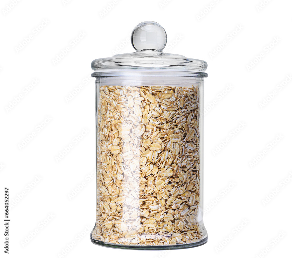 Oats in glass jar isolated on white background. Dry, uncooked oatmeal flakes