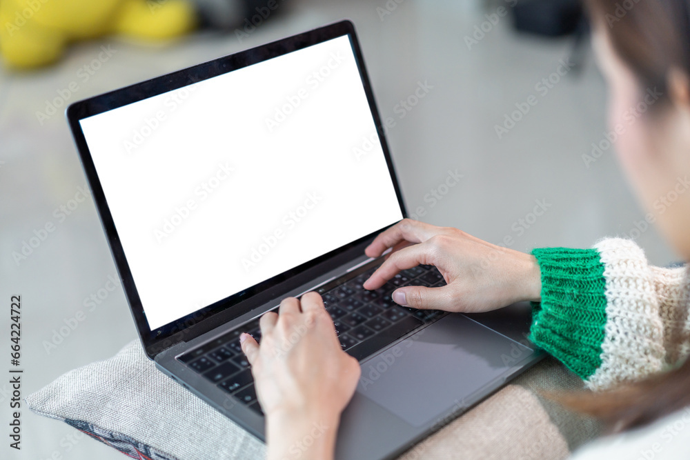 Woman working with modern laptop computer blank white desktop screen for advertising, mockup, technology, advertising, search information, creative design on table