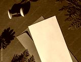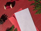 Christmas composition concept empty letter to Santa Claus on the red background. Winter holiday greeting card. Copy space