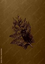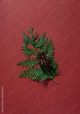 Christmas celebration concept with pine cone and thuja branch on red background.