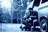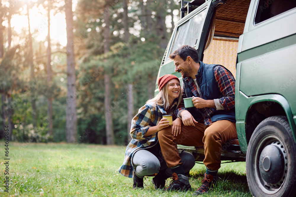 Happy couple enjoys in cup of warm tea while camping in nature in autumn.