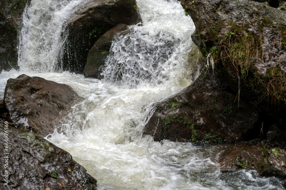 Rapid and powerful water flow between large rocks in cold mountain river, closeup