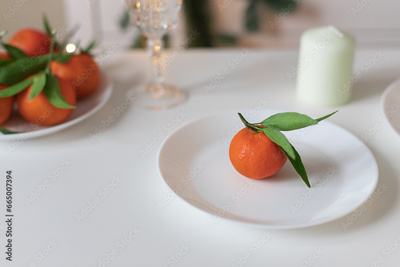 Fresh organic tangerine with green leaves on the plate on the white table. Christmas or New Year seasonal festive food concept