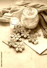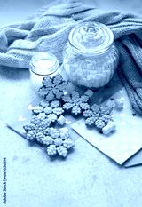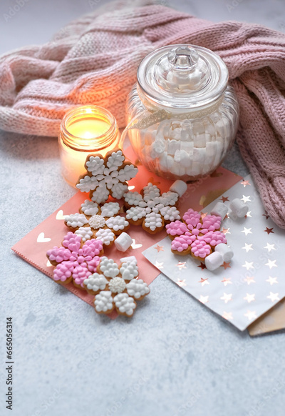 cozy Christmas background. Snowflake gingerbread cookies, candle, jar with marsmallows and knitted scarf on table. Festive winter season concept. Christmas, New year holidays
