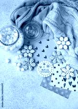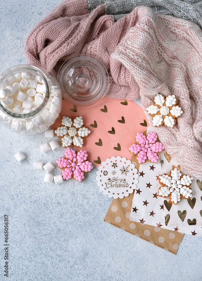 cozy Christmas background. Snowflake gingerbread cookies, greeting cards, jar with marsmallows and knitted scarf on table. Festive winter season. Christmas, New Year holidays concept. top view