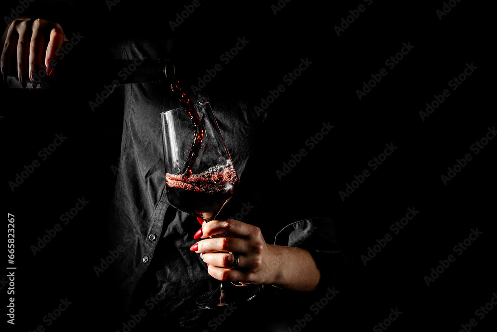 woman hands pouring red wine into a glass from a bottle on black background