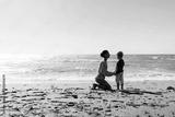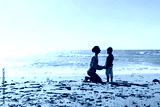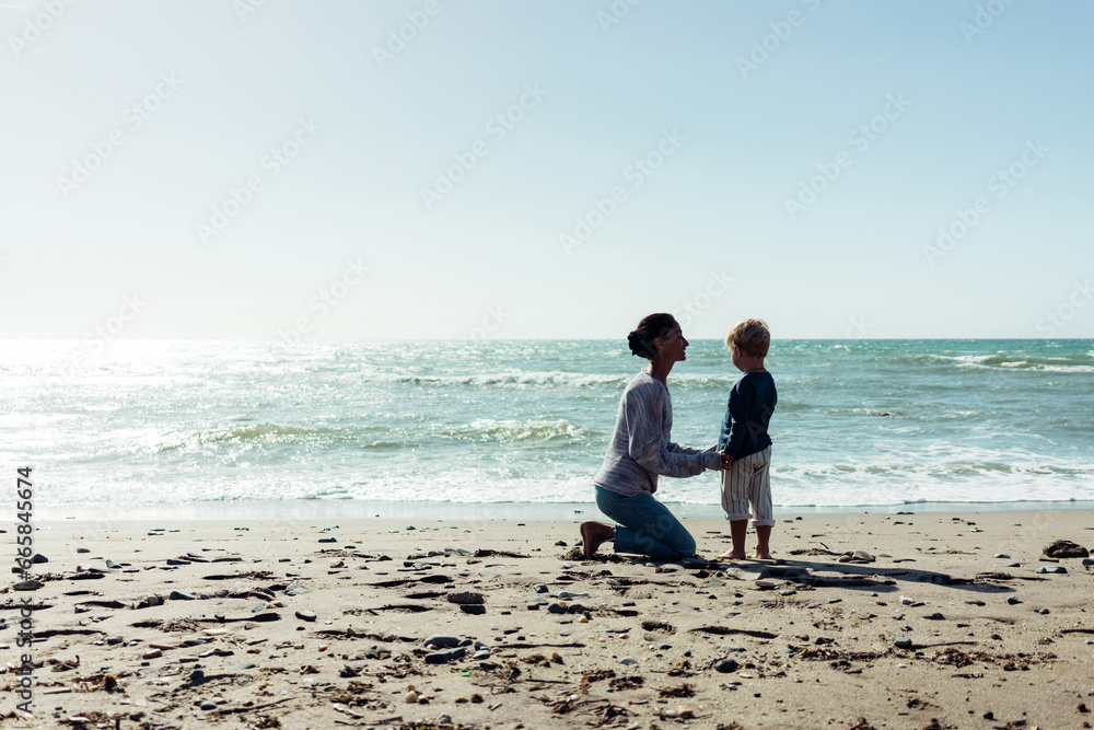 A young mother and her three-year-old son are walking barefoot on the seashore in the sand.