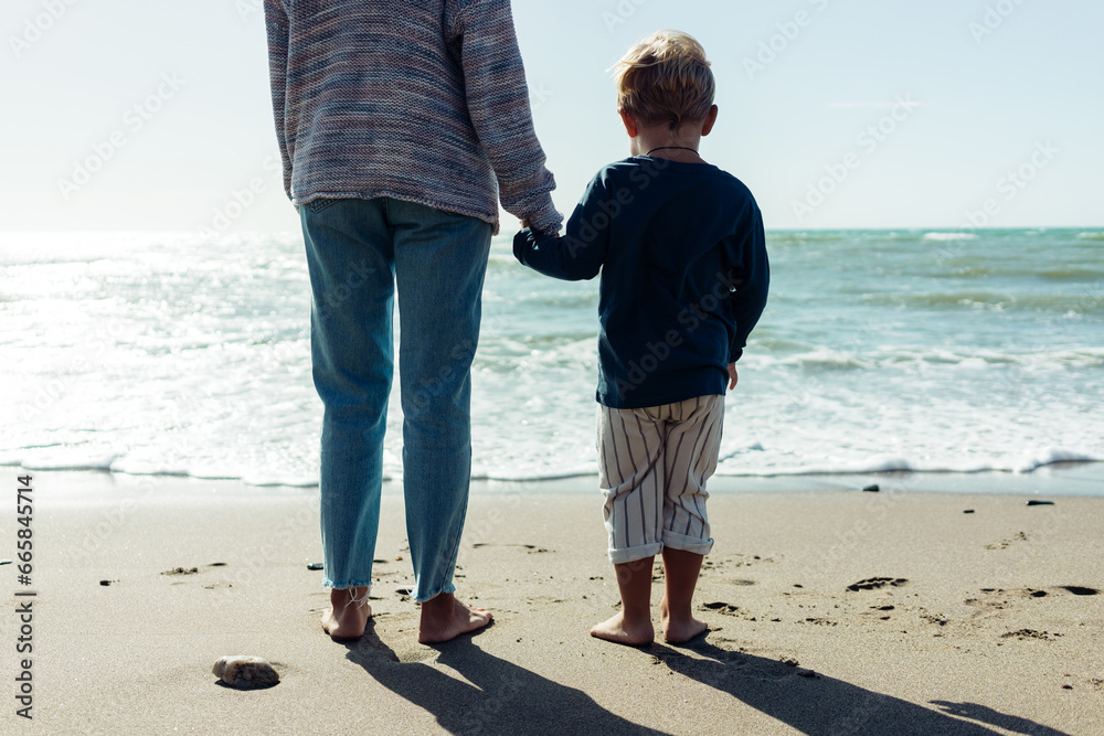 A mother and her little son stand, holding hands on the seashore.