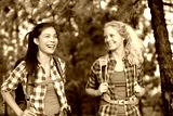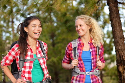 Healthy lifestyle women laughing hiking in forest
