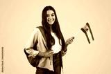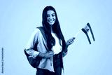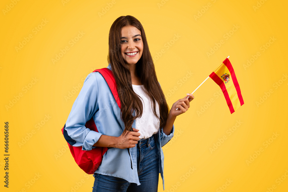Happy european young student lady, with Spain flag, combines patriotism with education
