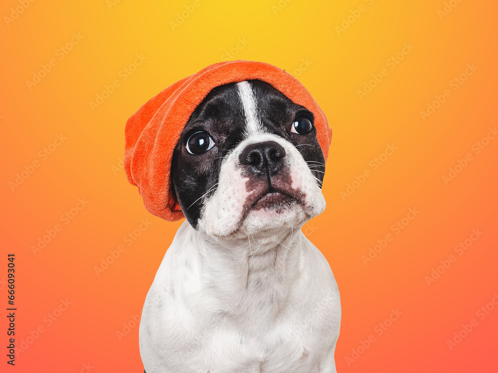 Cute puppy and a red knitted hat. Isolated background. Close-up, indoors. Studio shot. Day light. Beauty and fashion. Concept of care, education, training and raising pets