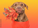 Cute brown dog, red shirt and autumn yellow leaves. Isolated background. Close-up, indoors. Studio photo. Day light. Beauty, fashion. Concept of care, education, training pets