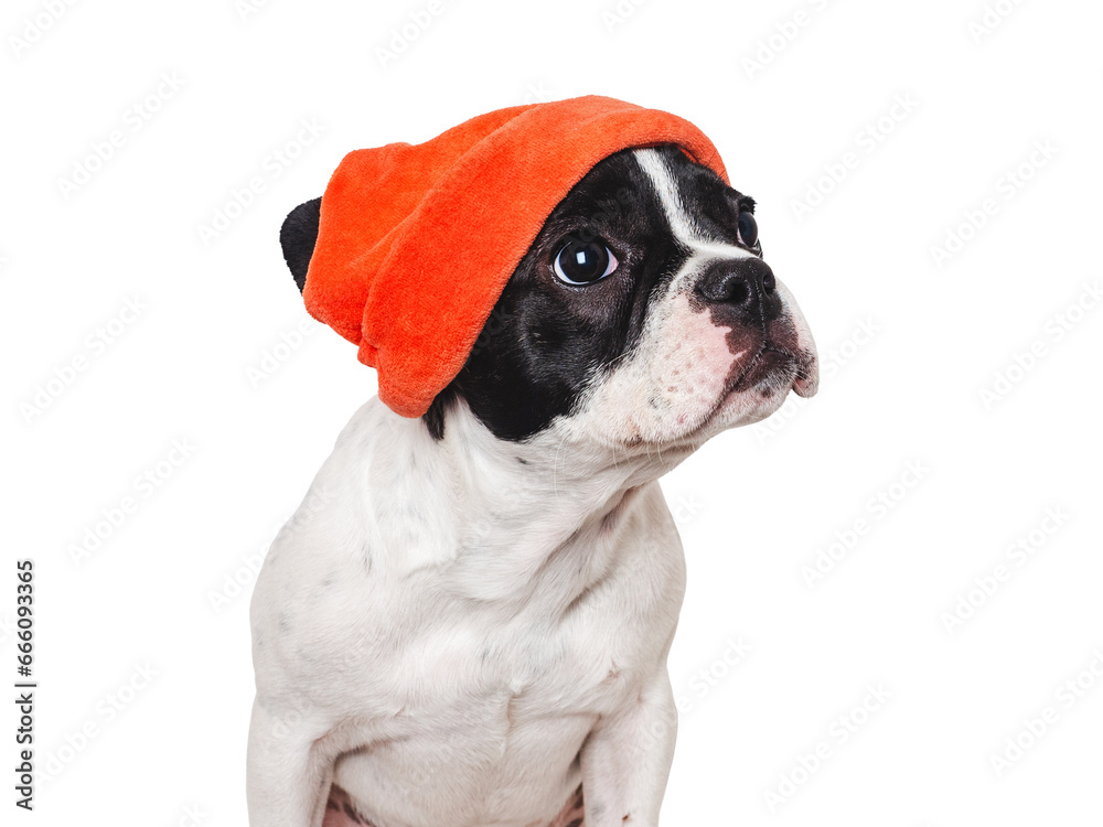 Cute puppy and a red knitted hat. Isolated background. Close-up, indoors. Studio shot. Day light. Beauty and fashion. Concept of care, education, training and raising pets