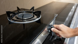 Male hand turning switch knob on modern gas stove in kitchen showroom. Cooking appliances in the domestic kitchen. Home improvement and House interior design concepts