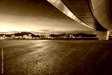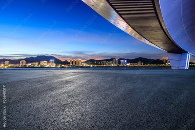 Asphalt road and bridge with city skyline at night