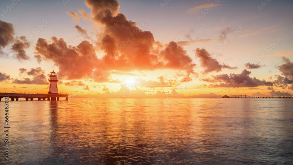 Beautiful lighthouse and coastline natural landscape at sunrise in Zhuhai, Guangdong Province, China.