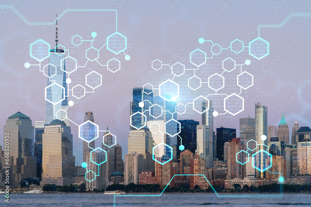 Skyline of New York City Financial Downtown Skyscrapers at sunset. Manhattan, NYC, USA. View from New Jersey. Decentralized economy. Blockchain, cryptography and cryptocurrency concept, hologram