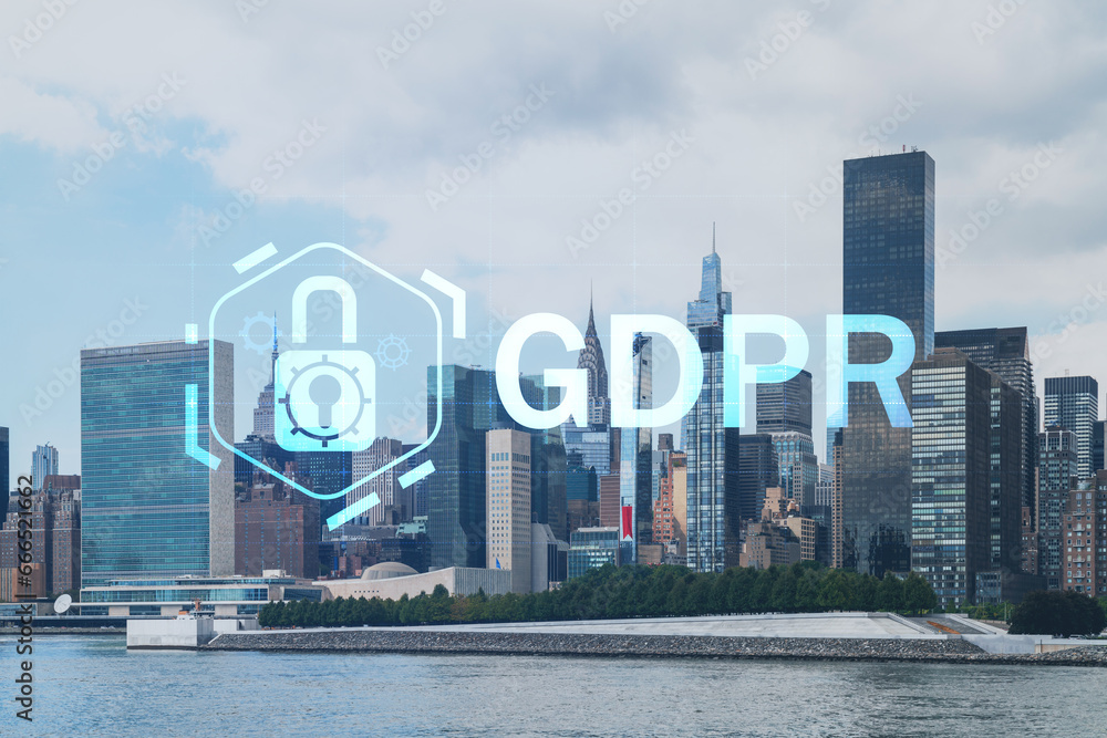 New York City skyline, United Nation headquarters over the East River, Manhattan, Midtown at day time, NYC, USA. GDPR hologram, concept of data protection, regulation and privacy for all individuals