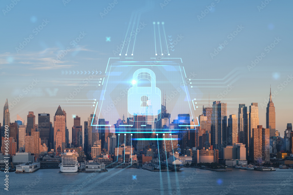 New York City skyline from New Jersey over Hudson River, Midtown Manhattan skyscrapers at sunset, USA. The concept of cyber security to protect confidential information, padlock hologram