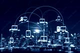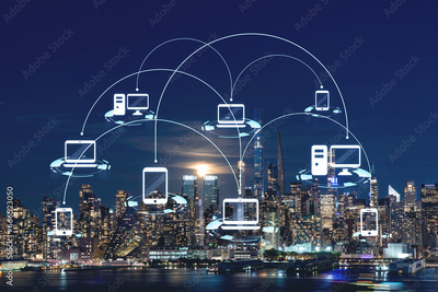 New York City skyline from New Jersey over the Hudson River with the skyscrapers at night, Manhattan, Midtown, USA. Social media hologram. Concept of networking and establishing new people connections