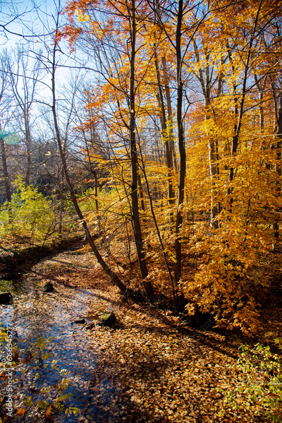 Small creek with fallen fall leaves natural trail park in Rochester, Upstate New York, US, beautiful thick carpet autumn leaf sunny clear sky, red and yellow maple trees