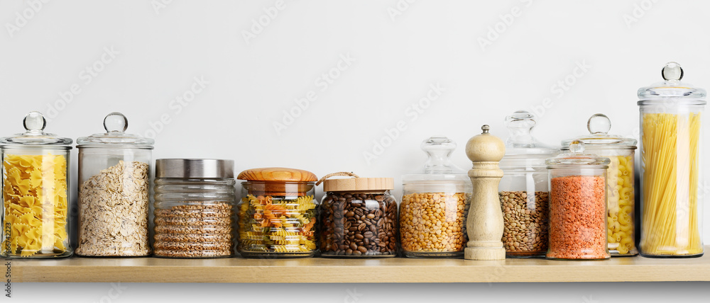 Kitchen shelf for storing food in glass jars on a white wall background