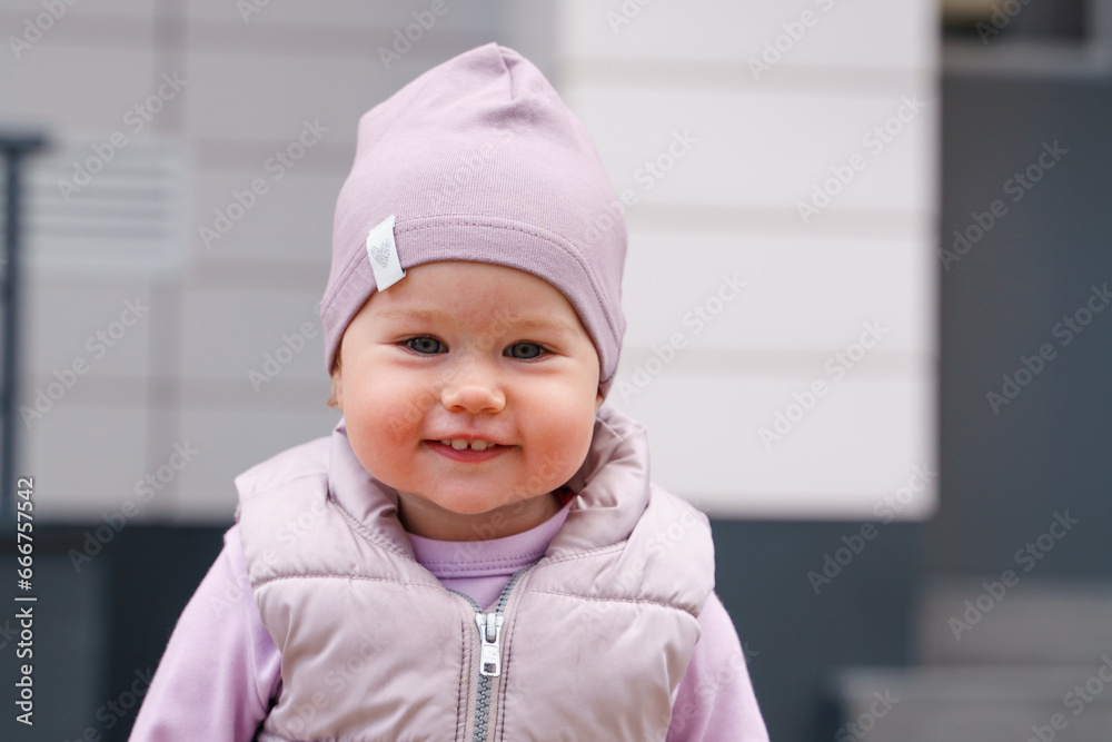 Happy little girl baby smiles, portrait of a little child outdoor