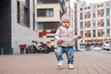 Cute baby 1 year kid in jeans walks around the yard inside high-rise buildings in the city, outdoor