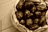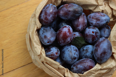Close-up of purple plums in a brown paper bag on wooden table with selective focus