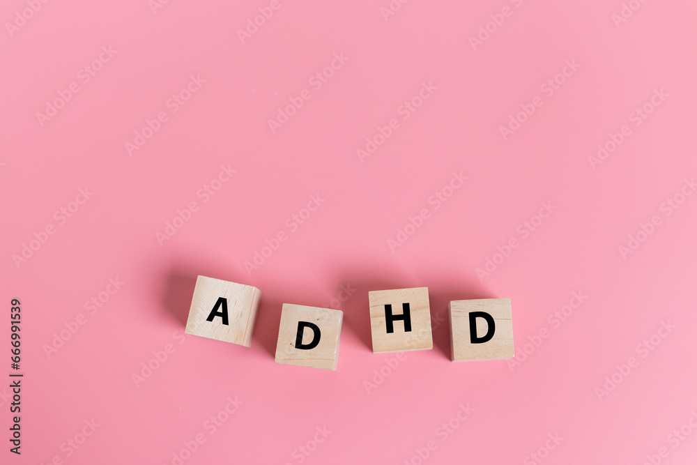 Wood cube block Abbreviation of ADHD on pink table. Attention Deficit Hyperactivity Disorder. ADHD concept.