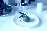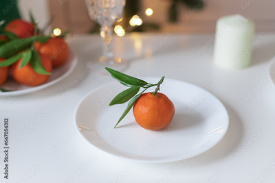 Fresh organic tangerine with green leaves on the plate on the white table. Christmas or New Year seasonal festive food concept