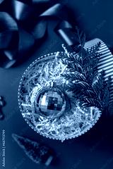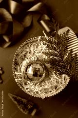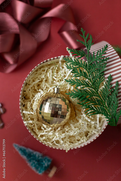 Christmas decorations in the round gift box with fir tree on the red background. Close up winter holidays greeting card.
