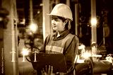 Asian Women Engineer checking facility system in factory and using technology visual screen AI learning support
