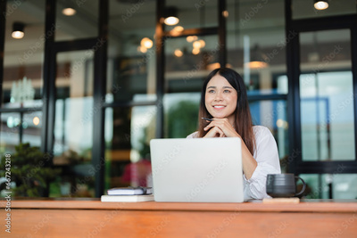 Writer woman thinking creative ideas for business data content and drinking coffee beverage in cafe..