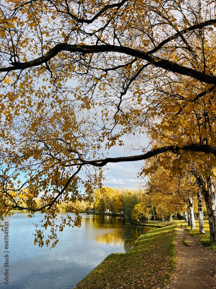 Autumn trees reflection on the pond surface in the park