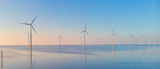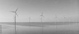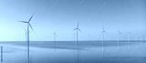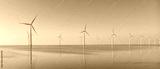 Windmill park in the ocean, drone aerial view of windmill turbines generating green energy electric,