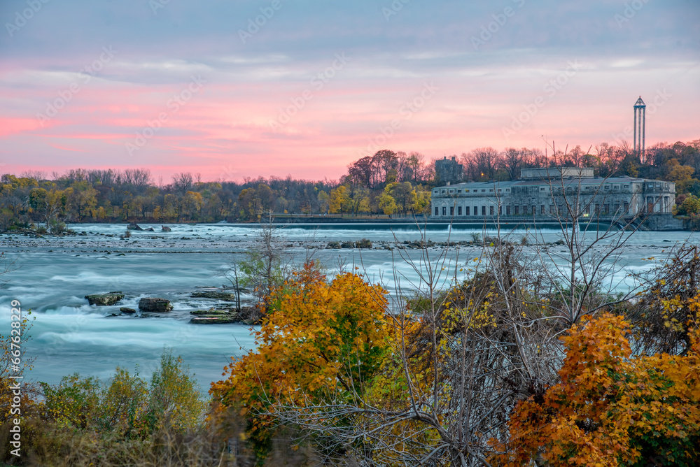 Colorful fall foliage at Brother Island from Horseshoe Falls viewpoint, Niagara Falls State Park at sunset, long exposure shot of fast flowing waterfall cascade